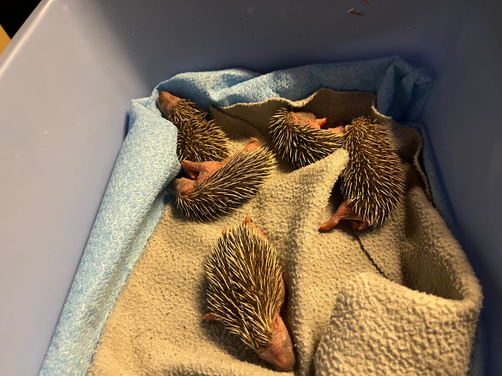 – se è un neonato (aculei morbidi, pelle rosa) o comunque piccolo e con gli occhi chiusi, mettilo in una scatola con un panno di pile o lana e sotto una fonte di calore ( borsa dell’acqua calda o bottiglia di plastica schiacciata piena di acqua calda);
